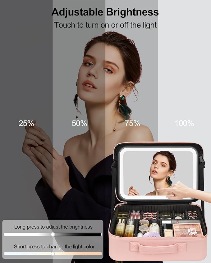 - USB Rechargeable Makeup Mirror: New generation makeup case design with LED makeup mirror, with cold white / natural / warm three-tone settings, and the brightness can be adjusted 0%-100%, which can perfectly meet your different makeup needs and make your makeup more delicate.