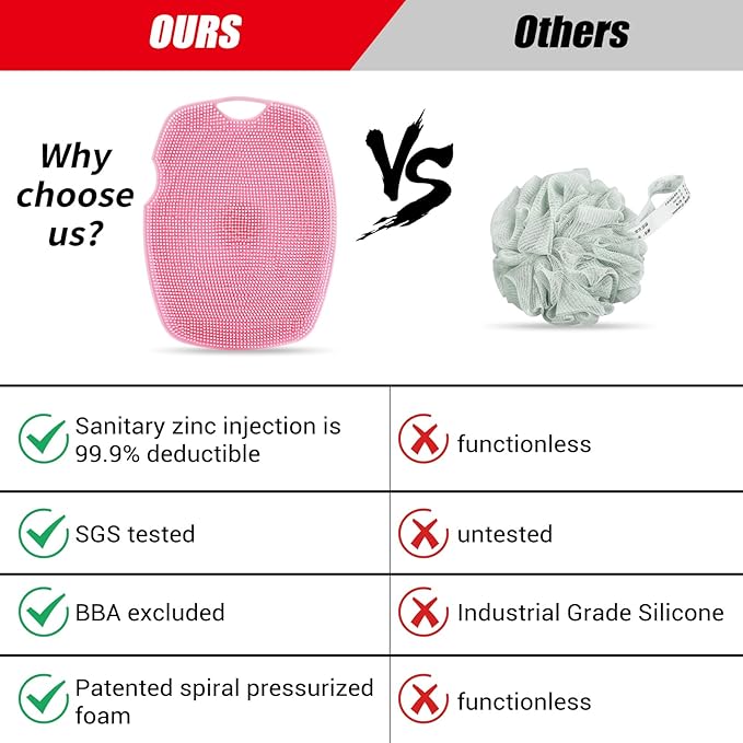- Zinc Technology - Zinc-infused silicone body scrubber effectively inhibit bristle and brush head hygiene and are 99.9% tolerant by SGS testing ISO-22196-2011 certified, making them ideal for sensitive skin.
