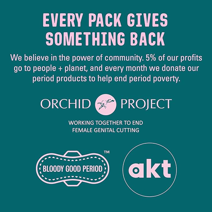 - Sustainable packaging: our eco-friendly bamboo pads + liners are biodegradable and individually wrapped in compostable, plant-based, plastic-free wrappers for on the go, packed in a 100% recyclable box