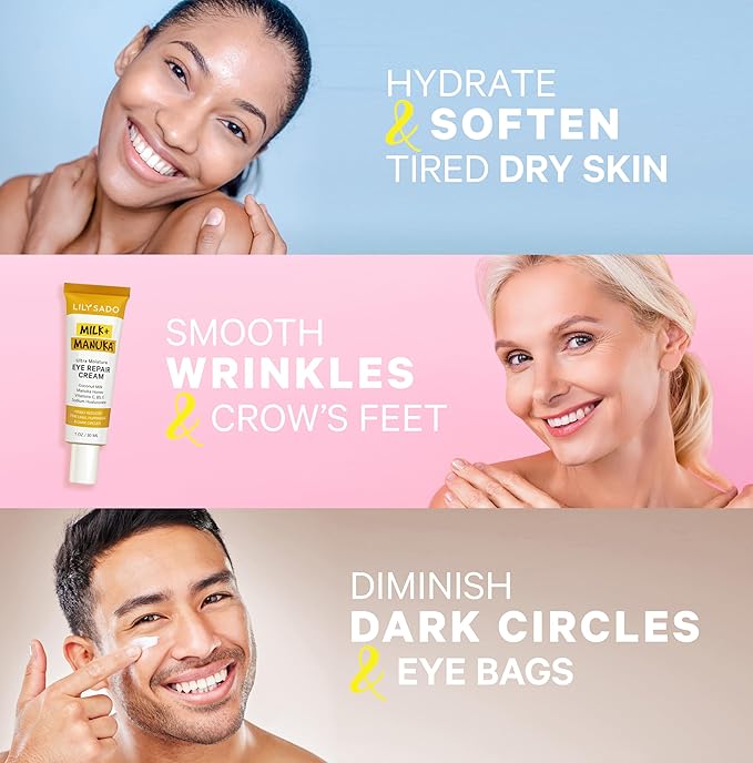 LILY SADO MILK+MANUKA™ Eye Repair Cream - Anti-Aging Natural Gentle Formula w/Coconut Milk, Manuka Honey, Sodium Hyaluronate & VITS C, B5 & E - Prevents Puffiness, Under-eye Wrinkles & Eye Bags - 1oz