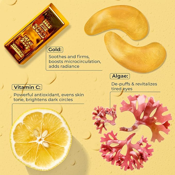 - PREMIUM CARE FOR YOUR EYES — These under-eye heroes are your secret to a glowing look. They’re infused with 24K gold molecules to illuminate and firm the skin. Collagen plumpes and smoothes & niacinamide evens out skin tone. Vitamin C reduces dullness and fatigue