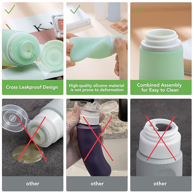 - 【Safety Material 】 Made of Food Grade BPA Free Silicone, this travel set is sturdy, soft, squeezable, flexible and reusable. Safe material guarantee that you can not only use them to store shampoo, conditioner, face soap, sunscreen, creams, lotion or etc.