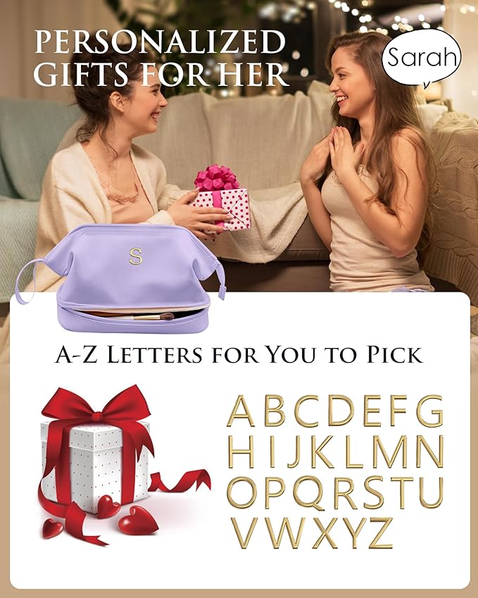 Birthday Gifts for Girls, Initial Large Makeup Bags, Personalized Double Layer Cosmetic Bag with Makeup Brush Organizer,Toiletry Bag, Gifts for Women Girlfriend Friends Female Mom Sister