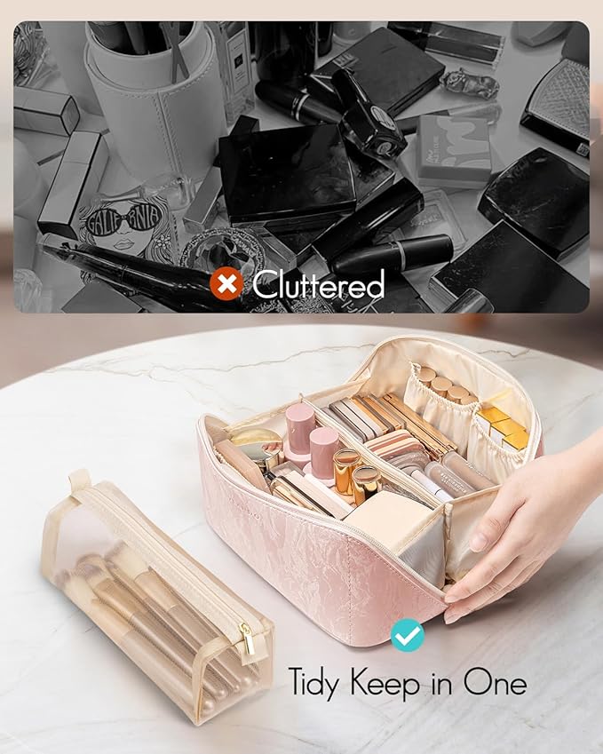 - Multiple Compartments: 2 large sections + 3 elastic pockets organize makeup/skincare. Middle zippered TPU pocket for small items; extra brush pouch keeps tools tidy and visible