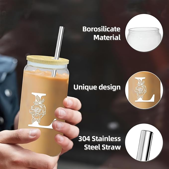 - The set includes: 16oz initial glass cup*1. Tote bag*1. Makeup bag*1. Jewelry storage box*1. Monogrammed pendant*1. Greeting card*1. Gift box*1. A beautiful personalized gift.Note: This product does not come with a straw brush and cup brush.