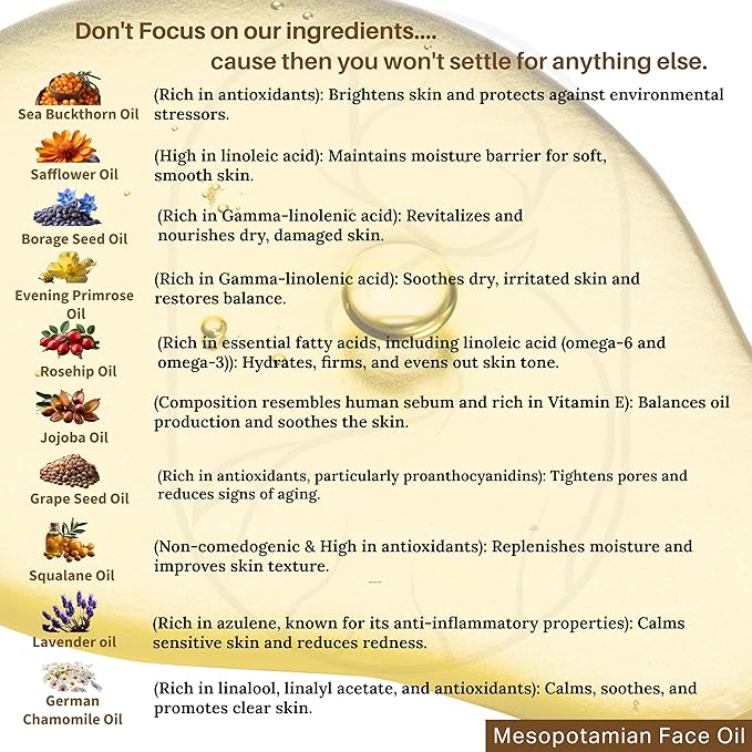 - BOTANICAL FACE OIL WITH OMEGA 3,6,7,9 — Crafted with 10 powerful plant-based oils, including Rosehip and Sea Buckthorn, naturally rich in Omega 3, 6, 7, and 9, along with vitamins and essential nutrients. This lightweight face oil for women deeply hydrates and nourishes, supporting soft, smooth, and healthy-looking skin. Formulated with plant-derived squalane, sourced from olives for a lightweight, silky finish.