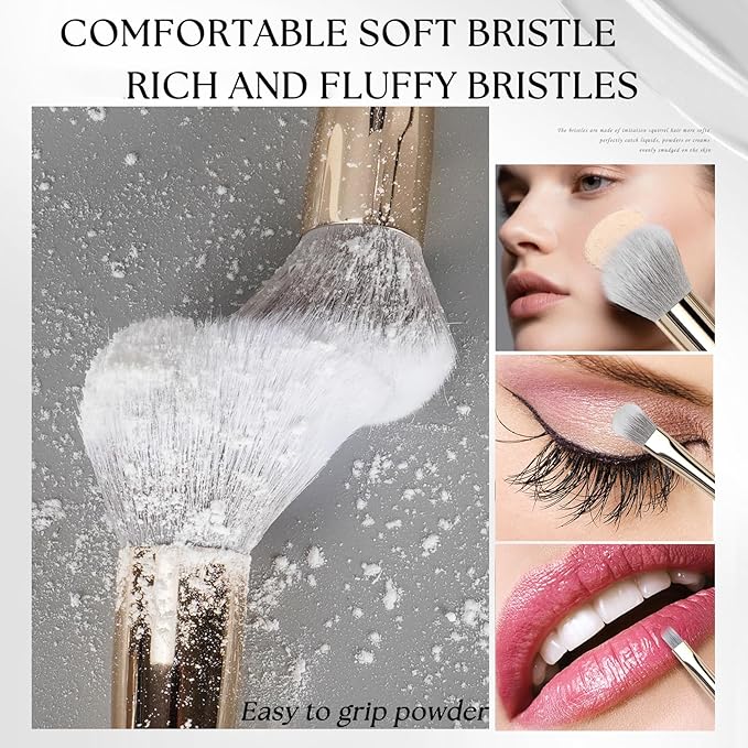 - [Multifunctional Usage]-This makeup brushes set contains all your beauty essentials,flawless application of foundation,powder,contour,and highlight.Additionally,it features precision brushes designed,The angled brush design allows for eyeshadow,concealer,lips,eyeliner,brows fan effects,and seamless blending.Each makeup brush has a unique label,so even beginners can easily understand how to use them,Ergonomic design allows for long-lasting makeup without fatigue
