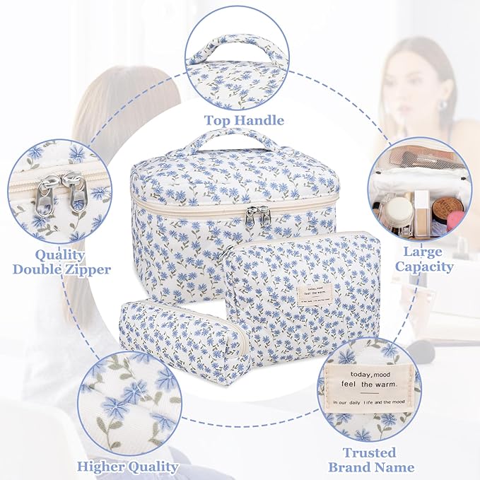 Makeup Bag Set, Quilted Makeup Bag, Large Floral Cosmetic Bag for Women, Cute Cotton Makeup Bags, Flower Travel Toiletry Organizer Bag (Blue Peacock Flower)