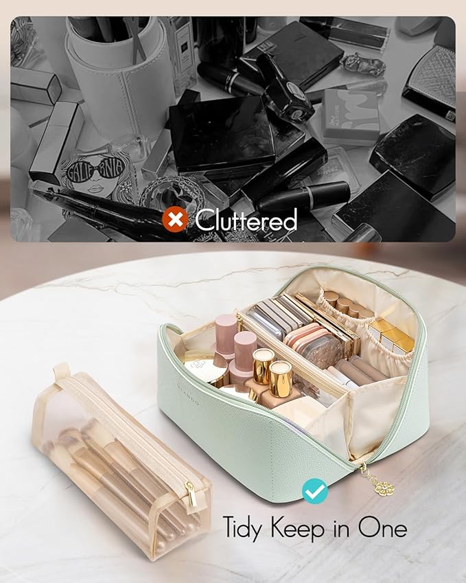 Vlando Makeup Bag,Large Capacity Toiletry Bag for Women Waterproof Portable Make up Pouch PU Leather Open Flat Cosmetic Bag(Mint Green)