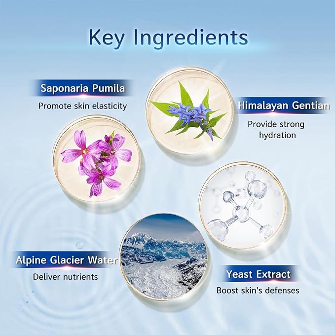 - 【Soothing & Hydrating】Yeast minimize moisture loss, boost skin's defenses and increase hydration levels. Alpine Glacier Water, rich in minerals, combined with natural extracts, delivers nutrients to the skin and restores vitality.