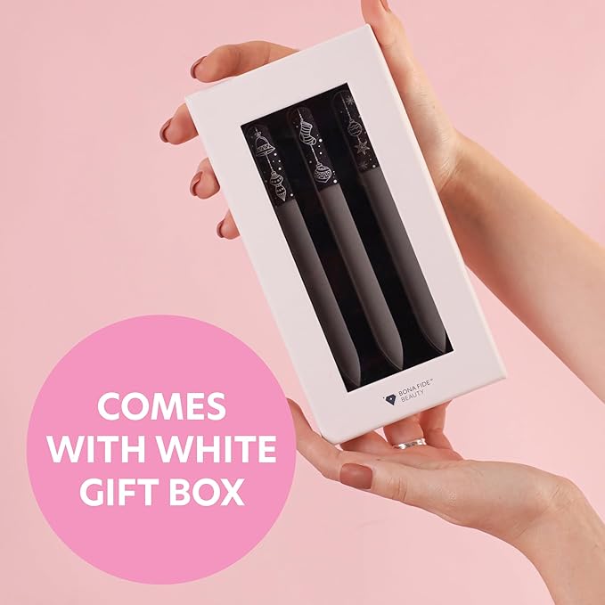 - Exclusive Holiday 3-Piece Czech Glass Nail File Set by Bona Fide Beauty: each nail file is crafted from authentic Czech glass, perfect for trimming, shaping and smoothing fingernails. The holiday designs add a touch of festiveness to your nail care routine, while the tempered (strengthened) glass material is known for its quality and effectiveness. The designs include: ornaments, stocking stuffer, and Christmas bell. All designed in-house by Bona Fide Beauty.