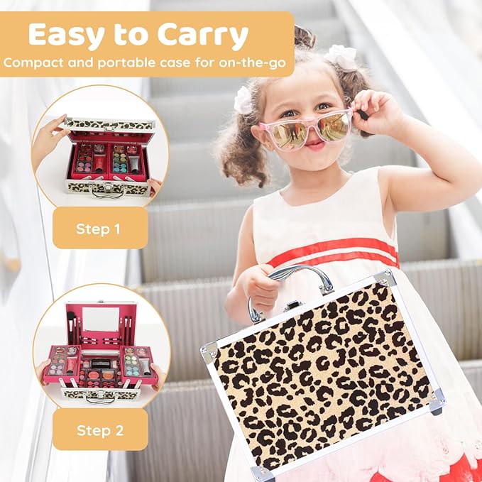 - All-In-One Teen Makeup Kit: Includes 7* eyeshadow palette (28 colors), 5* lip balm palette (20 colors), 2* blush, 4* eyeshadow cream, pink glitter gel, silver glitter gel, 8* brushes, eyeliner, lipstick, mirror, leopard cosmetic bag, and a tag, all neatly packed in a stylish makeup case
