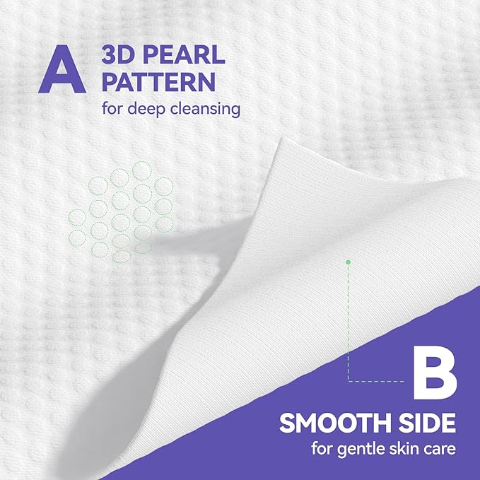 - 【Dry & Wet Dual Uses】Jolly Care face towelettes disposable are designed with a two-sided texture, one side is pearl pattern texture surface to increase friction for deep cleansing, and the other is smooth surface for wiping skin gently, with super absorbent to help dry your face after washing face and quickly remove makeup