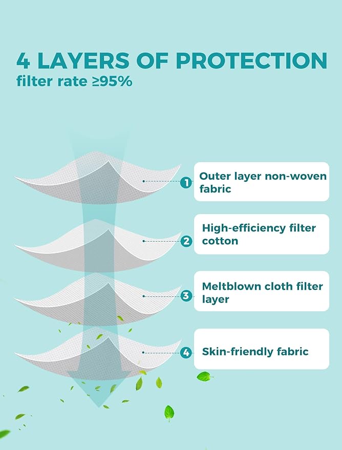- 【Advanced Protection】The KN95 mask offers a 4-layer defense mechanism: an outer waterproof non-woven fabric that captures large particles, two melt-blown layers that filter more than 95% of fine particulates, and a soft hot air cotton layer that provides additional PM2.5 filtration.