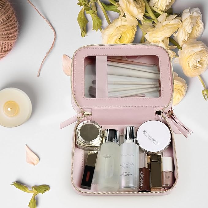 Prite Double Layer Makeup Bag for Women Portable Clear Makeup Bag Cute Waterproof Travel Cosmetic Bag with Gold Zipper for Car Essentials(Pearlescent Pink)