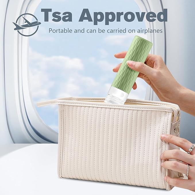 - TSA approval: 4 pack 3.4 oz travel bottles for toiletries are TSA approved that allows for unobstructed boarding. The tsa approved travel bottles are great for shampoo, conditioner, shower gel, lotion, hand sanitizer and ect. Additionally, the travel kit comes with a zippered clear transparent toiletry bag, which saves space, easy storage, and transportation. The travel size bottles are must have traveling accessories
