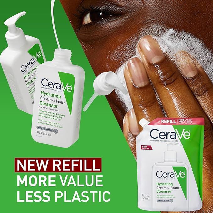 CeraVe Hydrating Cream To Foam Cleanser, Makeup Remover Face Wash For Dry Skin, Foaming Facial Cleanser With Hyaluronic Acid, Normal To Dry Skin, Fragrance Free & Non Comedogenic, 16 Ounce Refill