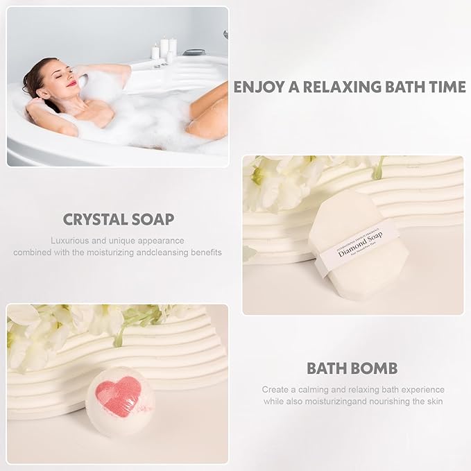 - 🎁【Relaxing Spa Gift Set for Women】Imagine the surprise moment when she receives the gift box, light the aroma candle and the light fragrance fills the whole bathroom, taking away the fatigue and stress of the day. Includes a diamond handmade soap and a bath ball to release a fresh, long-lasting scent for a dreamy bubble bath experience.