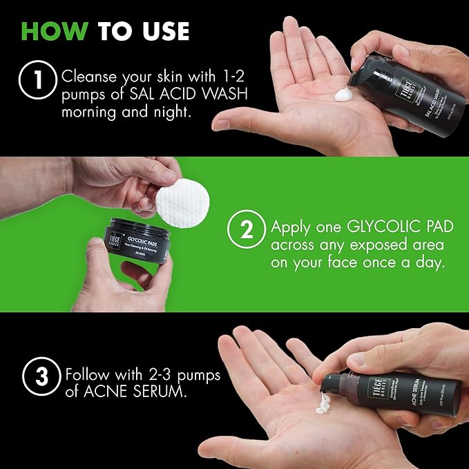 - How to Use: Both morning and night, rinse your face with warm water and cleanse with 1-2 pumps of SAL ACID WASH - spend about 10-15 seconds cleansing your skin, then rinse off with warm water. Pat dry and apply 1 GLYCOLIC PAD once daily, in the morning. Then, with a clean dry face, finish with 2-3 pumps of ACNE SERUM and massage on to your face.