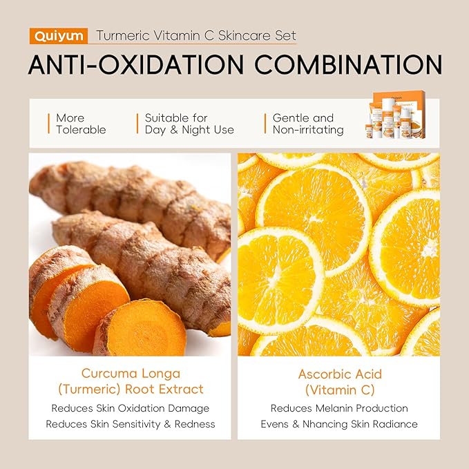 - 【Natural Skincare】QUIYUM Turmeric Vitamin C Skin Care Set includes face wash cleanser, toner, serum, eye cream and face cream. can deeply cleanse the skin while also reducing sebaceous gland oil secretion; Furthermore, they are effective in the reduce of acne, the balance of skin discoloration, and the smoothing of the skin
