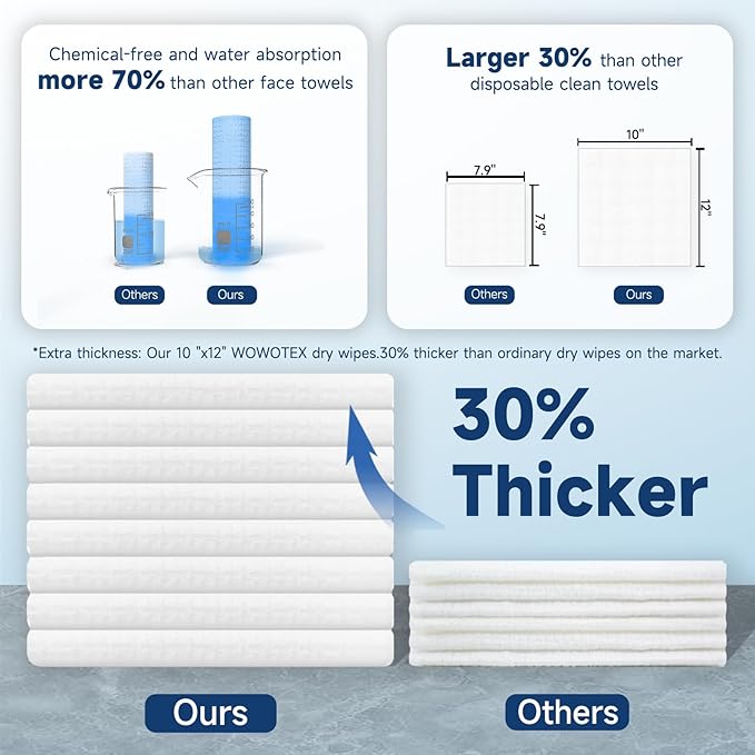 - DRY AND WET DUAL USE: The soft face towelettes disposable has excellent breathability and water absorption, Allows excess water to be absorbed immediately after you wash your face, hands or neck. Add water ideal for makeup removal, house cleaning, etc