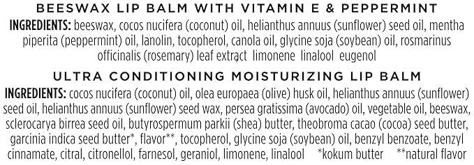 - TWO VARIETIES: Ultra Conditioning Lip Balm contains more butters and less wax than other balms for ultimate hydration; Beeswax lip balm has a final hint of peppermint oil for a refreshing tingle