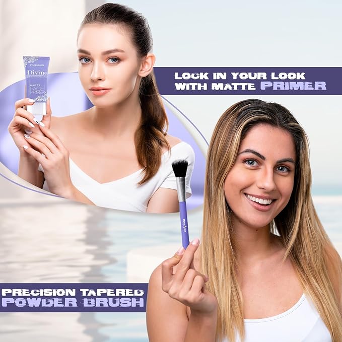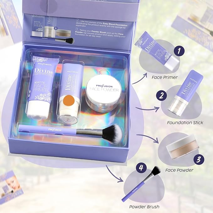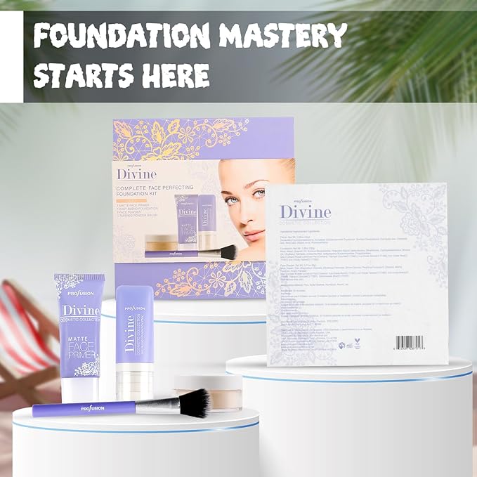 Profusion Cosmetics Divine Face Perfecting Foundation Kit, Including 1 Matte Face Primer, Foundation, Powder, Tapered Brush for Flawless Makeup
