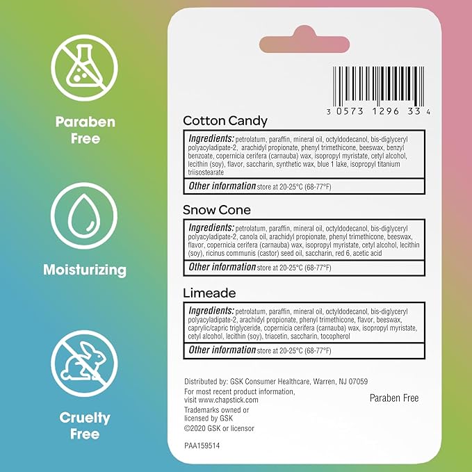 - CHAPSTICK FAN FAVORITES: Make every day more fun with twelve 3-packs of moisturizing lip balm sticks. Each set includes Snow Cone, Limeade, and Cotton Candy.