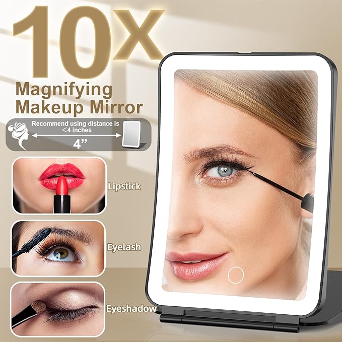 Mocado Travel Makeup Mirror with Light, 1x/10x Magnifying Mirror with Light, 3 Colors Lighted Magnifying Mirror, 2000mAh Rechargeable Lighted Makeup Mirror, Dimmable Touch, Memory Function (Black