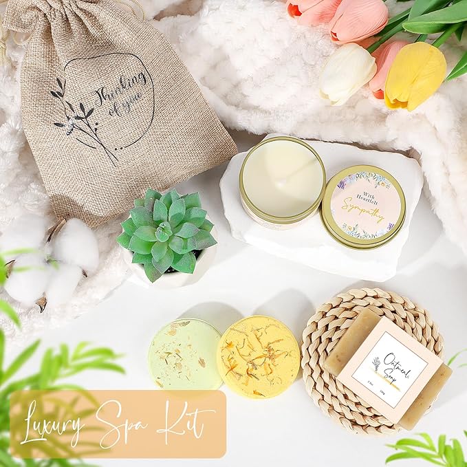 - 【Sympathy Gifts Basket】: This sympathy gift basket for women and grief gifts for women full of high-quality items, an oatmeal handmade soap, 2* bath bomb, a scented soy wax candle, an artificial succulent, warm and cozy socks, a ceramic mug, a spoon, a luxury knitted blanket, a burlap gift bag with a drawstring and a sympathy card. item is selected to provide relaxation and solace. sympathy gift basket with a blanket