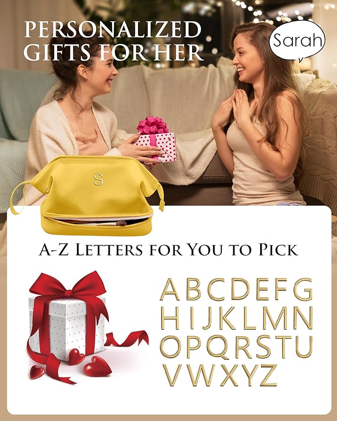 Monogrammed Gifts for Women, Initial Makeup Bag, Travel Gifts, Personalized Bags, Waterproof Double Layer Cosmetic Bag,PU Leather Makeup Bags Letter Travel Toiletry Bag, Friend Gifts