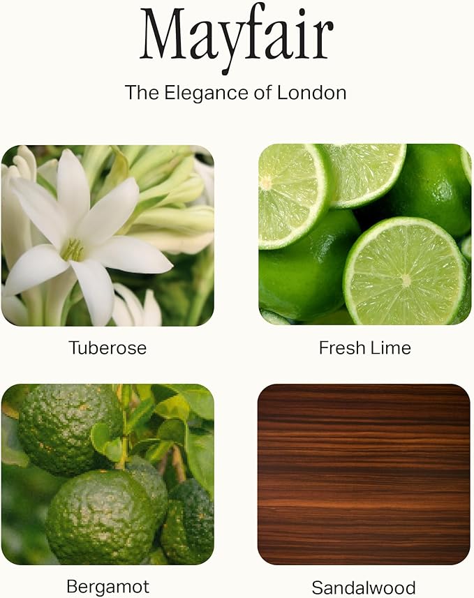 - SCENT NOTES: Mayfair captures the enchanting essence of springtime in London, blending vibrant freshness with floral elegance. Scent notes of bergamot, fresh lime, tuberose & sandalwood