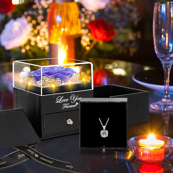 - ❤ 【 Preserved Rose with Necklace】Unique double heart-shaped structure and is engraved with " I LOVE YOU necklace 100 Languages " to express love to her. The two hearts are tightly intertwined, symbolizing the love for each other and it will be an exclusive gift for her.The i love you necklace on hidden inside bottom of the rose box, as a romantic gifts for her, Unique design of double love "I LOVE YOU necklace" and gift box preserved rose, gift Ideas for women for every romantic occasion.
