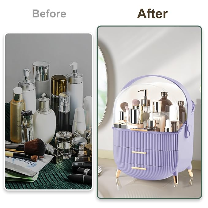 Makeup Organizer for Vanity, Make up Organizers and Storage, Cosmetics Skincare Organizers with Lid and Drawers, Cosmetic Display Cases for Countertop, Bathroom, Dresser, Ideal Gifts for Women(Purple)