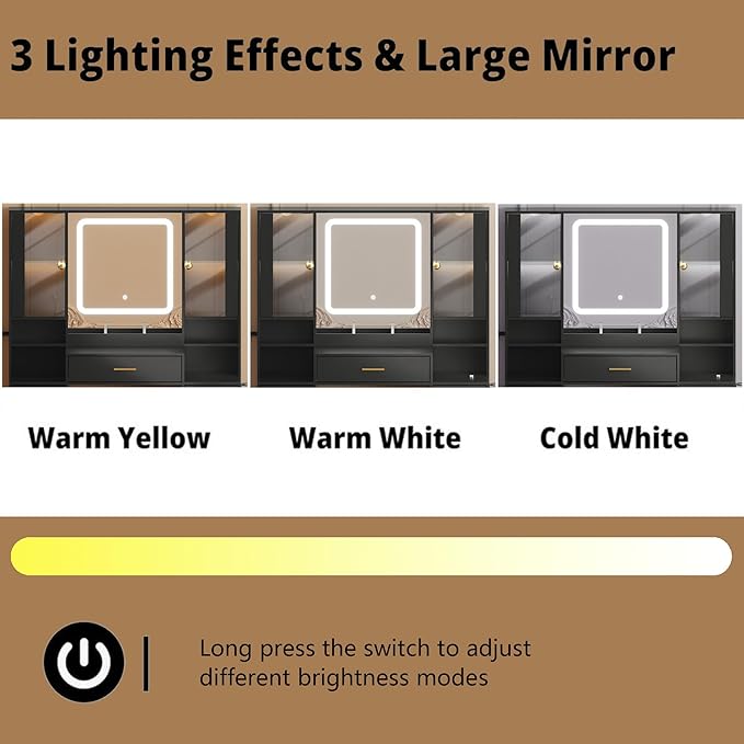 - LED Strip Mirror with Adjustable Lighting: BORNOON makeup vanity features an LED light strip integrated into the mirror frame, offering soft and evenly distributed lighting for a flawless makeup application. The vanity desk with mirror and lights provides multiple brightness levels and color temperatures to suit different needs, creating the perfect ambiance for any time of day. It's the ideal makeup vanity to elevate your beauty routine.