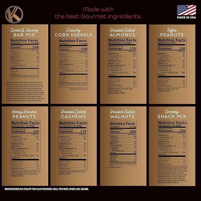 - Premium Assortment: Includes 9 gourmet favorites—Toffee Peanuts, Roasted Salted Almonds, Roasted Salted Cashews, Roasted Salted Walnuts, Crunchy Corn Kernels, Honey Roasted Peanuts, Sweet & Savory Bar Mix, Smokey Snack Mix, and more