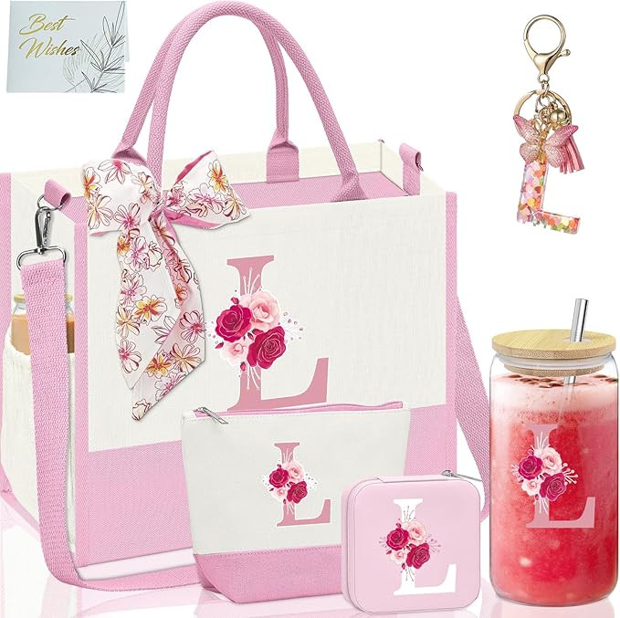 Monogrammed Gifts for Women,Personalized Gift for Women,Initial Canvas Tote Bag,16oz Initial Glass Cup,Makeup Bag for Sister,Jewelry Organizer Box,Birthday Gifts for Aunt Niece-L