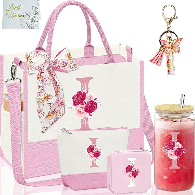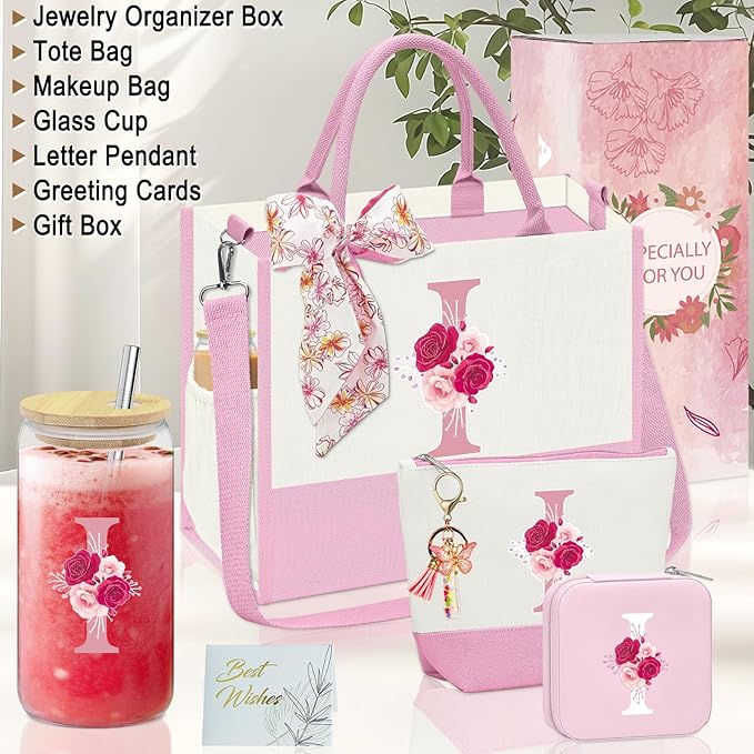 - The set includes: 16oz initial glass cup*1. Tote bag*1. Makeup bag*1. Jewelry storage box*1. Monogrammed pendant*1. Greeting card*1. Gift box*1. A beautiful personalized gift.