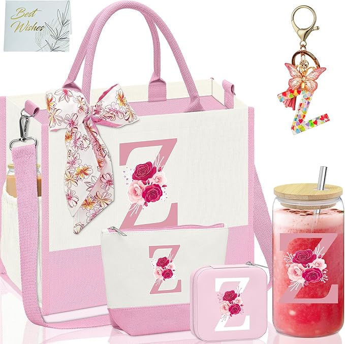 Monogrammed Gifts for Women,Personalized Gift for Women,Initial Canvas Tote Bag,16oz Initial Glass Cup,Makeup Bag for Sister,Jewelry Organizer Box,Birthday Gifts for Aunt Niece-Z