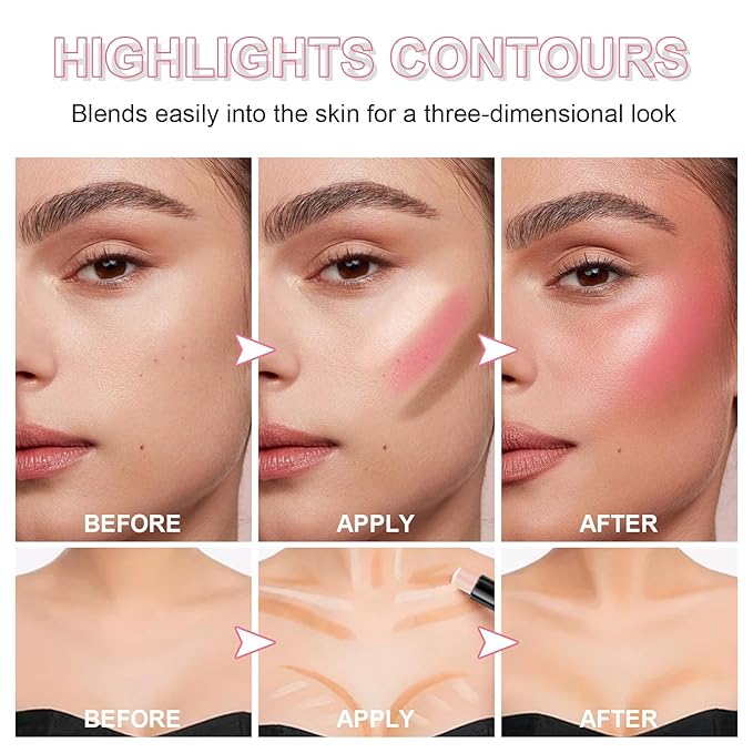 - 【Widely Used】The Dual-ended design made easy to apply and portable! the light end is good for blendable highlight such as forehead,cheek,neck,and outer corner of the eye.While the deep end as BRONZER for contouring makeup, perfectly outline various sculpted and 3D delicated Look.