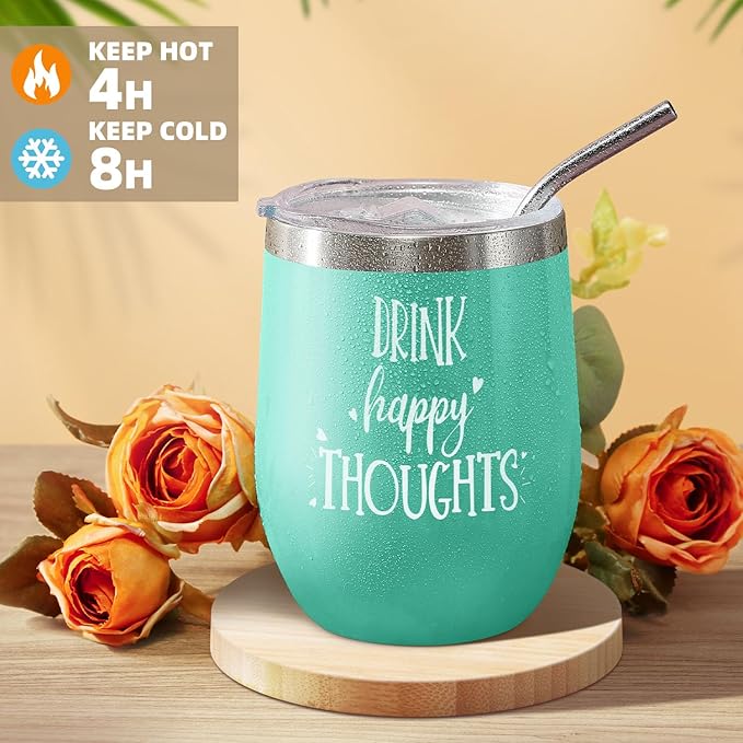 - INSULATED VACUUM TUMBLER: Made of 18/8 food-grade sturdy stainless steel.The 12oz tumbler with lid and straw isn't just a cup - it's 4hr hot or 8hr cold retention magic with "Drink Happy Thoughts" inspiration. Perfect as thank you gifts for nurses, teacher appreciation gifts, or best friend gifts for women who cherish practical luxury.