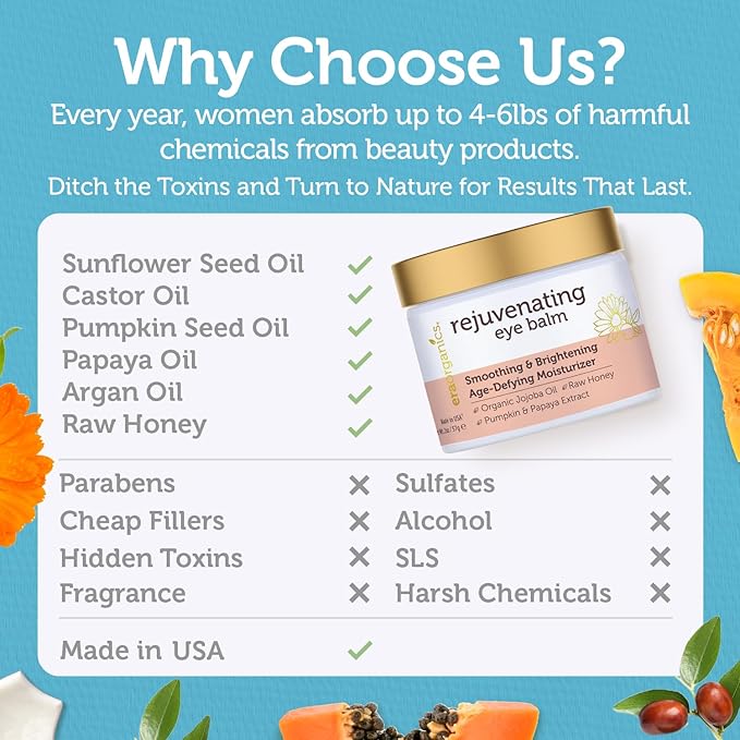 - Rejuvenating Eye Balm: Our USDA Organic Eye Cream targets puffiness, dark circles, and crow’s feet with nutrient-rich botanicals like Calendula, Coconut Oil, and Rosemary Extract, helping to keep your delicate under-eye area firm and refreshed.