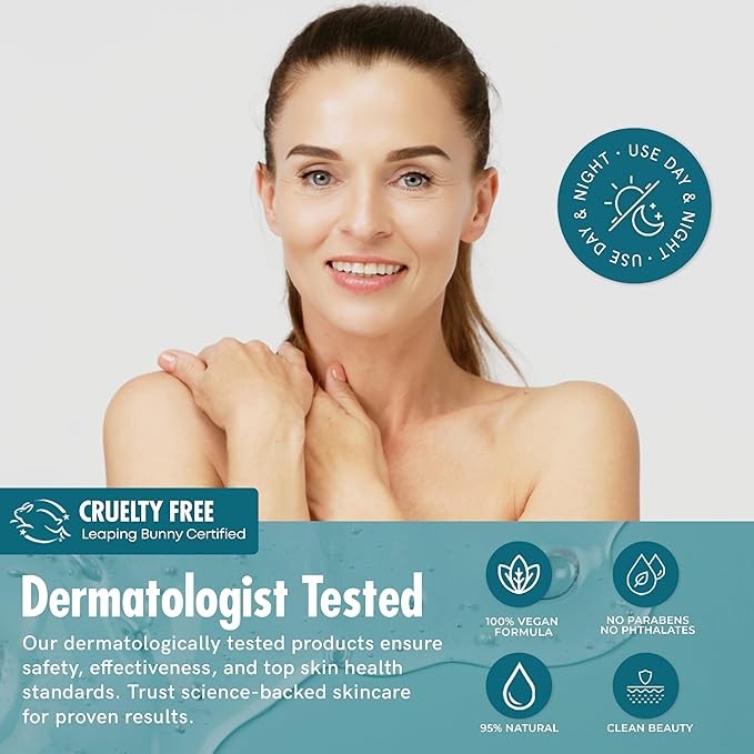 - CLEAN, SAFE & EFFECTIVE INGREDIENTS - Made with 95% natural ingredients, this dermatologist-tested serum is cruelty-free, vegan, and non-GMO. It contains no parabens, sulfates, phthalates, or harsh chemicals, making it suitable for all skin types, including sensitive skin. Experience clean beauty without compromise.