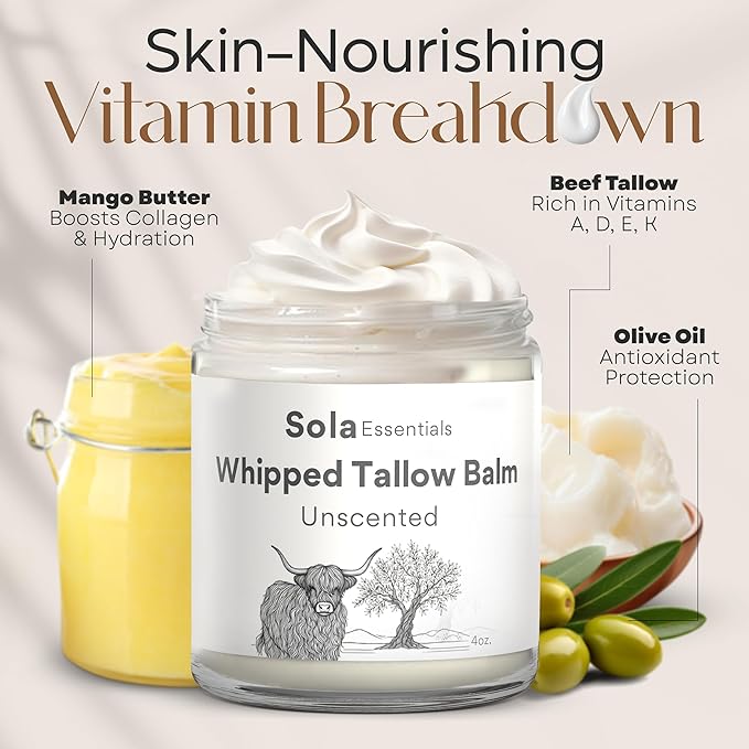 - Whipped & Deeply Moisturizing - Our beef tallow moisturizer is luxuriously whipped for a smooth, fluffy texture that glides effortlessly onto the skin. It absorbs quickly, delivering intense hydration without a greasy feel. Perfect for nourishing dry or sensitive skin!