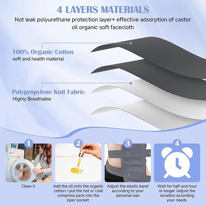 - [ Adjustable Castor Oil Organic Pack - Wildly Used ] Our upgrade castor oil pack wrap organic cotton design with a fully adjustable elastic strap / velcro / button adjustment strap ,which is perfect for most body shapes and sizes. The waist castor oil wraps zipper pocket apply heat/cold compress to your abdomen/stomach which can promote the absorption of essential oil and blood circulation. Castor oil pack wrap suitable for people with a waist circumference of 27-47in