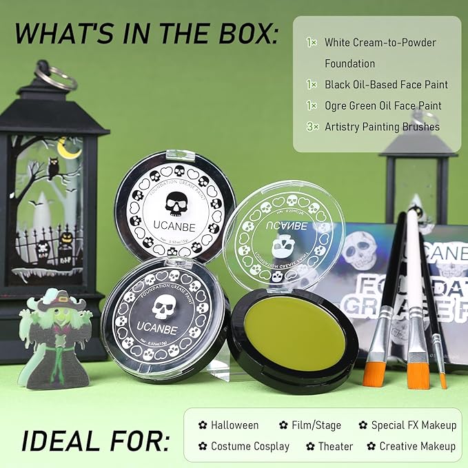 - 【White-Black-Ogre Green Face Body Paint Cream Makeup for Daily & Halloween】UCANBE face paint kit contains 3 colors professional face paints with 3pcs painting brushes. The white foundation face makeup paint is specially crafted with cream-to-powder formula that glides on like cream yet settles down to a matte finish. The black and green face paints, with silky texture, are oil-based cream makeup paints that goes on smoothly and easy to blend and layer for flawless opaque makeup. UCANBE White Pressed Setting Powder is highly recommended to set makeup quickly and last all day long