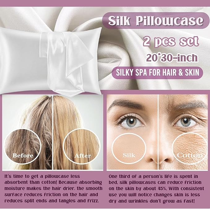 - There's one special item in the gift basket: a pair of silk pillowcases! A solution to her waking up in the morning with dry skin and tangled hair, every woman needs a couple of silk pillowcases! As a less-absorbent fabric than cotton, it relieves dry skin and hair, and the silky touch reduces friction on the skin and hair, which slows down the growth of wrinkles and reduces split ends