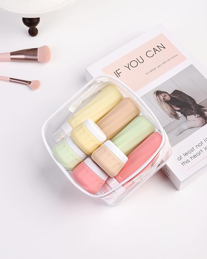 Travel Bottles for Toiletries 8 Pack, Travel Size Toiletries, Tsa Approved Travel Size Containers 3oz, with Travel Essentials Clear Bag, Leak Proof Silicone Squeezable Creams Jars