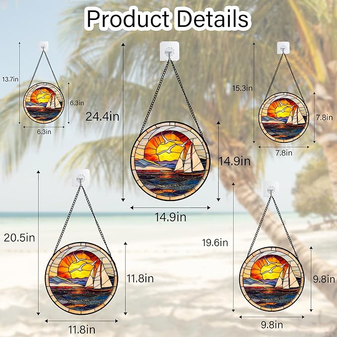 Stained Glass Window Hanging, Sun Ocean Sailboat Seagull Abstract Suncatcher Diamond Glass Panel Sun Catchers Decor for Birthday for Women, Men, Wife, Aunt, and Mom 14.9x14.9 in