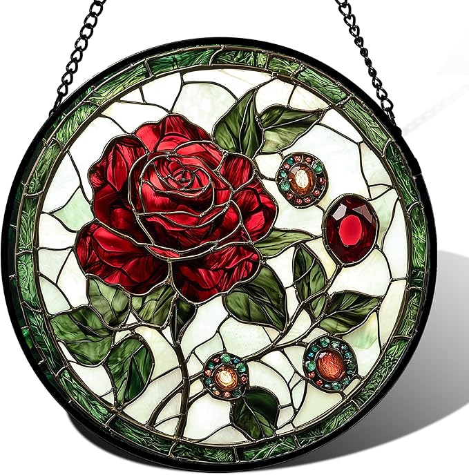 Stained Glass Window Hanging, Red Rose Gemstone Green Sun Catchers Diamond Glass Panel Hangings Suncatcher Decor for Birthday for Women, Men, Wife, Aunt, and Mom 14.9x14.9 in